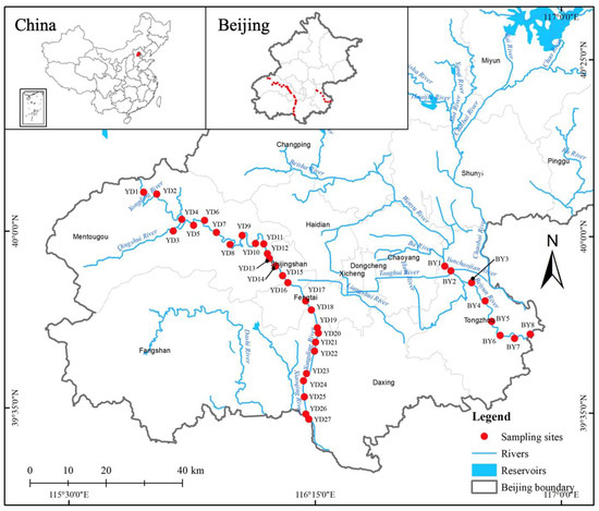 The study targets were the Yongding River and the Beiyun River (Figure 1). Thirty-five samples (27 from the Yongding River and 8 from the Beiyun River) were collected in January of 2022. Pretreatment of the collected samples was performed according to previous methods [21,25,26].