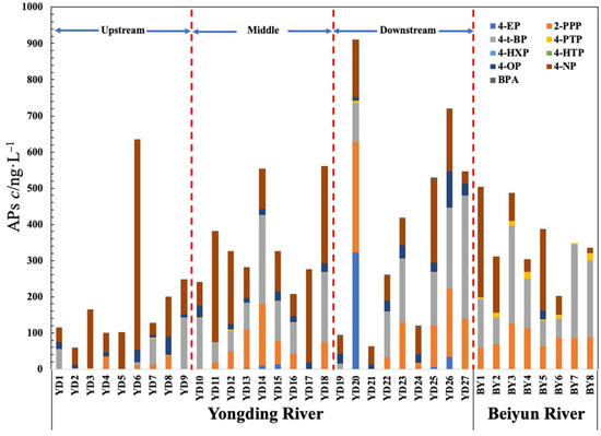 The differences in the distribution patterns of the AP concentrations in the Yongding River and Beiyun River sampling sites were further analyzed to examine the distribution differences in the AP concentration levels at the different sampling sites, as detailed in Figure 4. Sampling Points YD20 and YD26 were in the lower reaches of the Yongding River, with many residential areas, hospitals, and sewage plants nearby. The generated sewage discharge was considered to be one of the important sources of the high concentrations of APs [33]. However, Sampling Point YD6 was located in the upper reaches of the Yongding River, with no serious sources of pollution nearby. As can be seen in Figure 2 and Figure 4b, the sampling results revealed that 4-OP, 4-NP, and BPA displayed high values at Sampling Points BY5, BY1, and BY3 in the Beiyun River. Sampling Point BY1 was located in the upper reaches of the Beiyun River and Wenyu River, with many schools, residential communities, and hospitals nearby. Sewage containing 4-NP may have been discharged into the river at that location, resulting in the observed higher AP concentration values in that section.