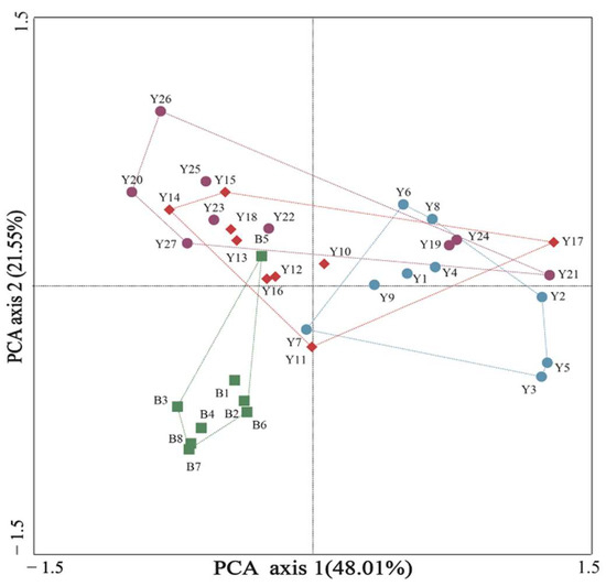 PCA was performed on the distribution of all APs at 27 points along the Yongding River and 8 points along the Beiyun River in order to have a better comprehension of the differences in the spatial distribution patterns. The results are shown in Figure 3. The PCA and regional significance analysis focused on nine sampling sites in the upper reaches of the Yongding River (Points YD1–YD9); the middle section of the Yongding River (Points YD10–YD18); the lower reaches of the Yongding River (Points YD19–YD27); and the Beiyun River, and significant differences were observed (ANOVA, R = 0.186, p = 0.005 < 0.05). The sampling sites of the Yongding River were roughly divided into three sections: upper, middle, and lower sections. The upper reaches of the sampling points were basically assessed together, as were the downstream sampling points. It was confirmed that the levels of AP concentrations in the middle and downstream segments were higher than those in the upstream segments. However, there were also some abnormal sampling results observed. With the exception of Point BY5, all the sampling points of the Beiyun River were clustered together, which verified that the water sources were mainly unconventional (wastewater treatment plant return water, agricultural irrigation return water, etc.), and the pollutant concentration levels were basically stable throughout the Beiyun River [32].