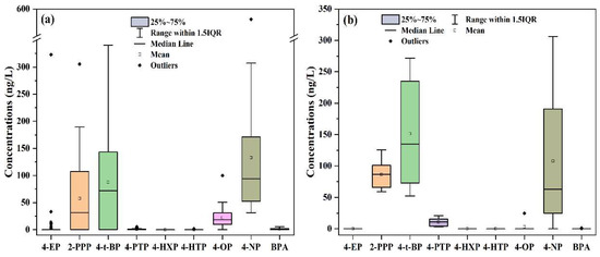 Alkylphenols (APs) are typical endocrine-disrupting chemicals (EDCs). APs are extensively used as feedstock for alkylphenol polyoxyethylene ethers (APEOs). They are used in the production of phenolic resins, heat stabilizers, antioxidants, and hardeners [12,13,14]. APs in a water environment are mainly produced by the biodegradation of long-chain ethoxylates. Those ethoxylates can be removed by conventional wastewater treatment technologies [15,16], but APs may be more persistent, lipophilic, and toxic than their precursors [14]. They tend to be present in higher concentrations in the environment compared with other EDCs [17,18]. APs have been continuously detected in river water and sediment, usually at the concentration levels of ng/L or ng/g. The results of the study conducted by Lei et al. [19] confirmed that nonylphenol (NP), octylphenol (OP), and bisphenol A (BPA) could be detected in 100% of the urban rivers in Beijing, Tianjin, and Hebei, with concentration levels between 23 and 255 ng/L. Cheng et al. [20] showed that the concentrations of NP, OP, and BPA in the Yongjiang River Basin were 140–3948, 6–828, and 15–1415 ng/L, respectively. Li et al. [21] determined that the concentrations of three phenolics (NP, OP, and BPA) in the Pearl River sediment varied from 204.4 to 12,604.3, 32.6 to 297.3, and 12.8 to 298.4 ng/g, respectively. In the river sediment of the Duliujian River, the concentration levels of those same substances ranged from 153.5 to 3614.9 ng/g, 90.7 to 990.0 ng/g, and 83.5 to 913.3 ng/g, respectively. Although the above-mentioned concentration levels of APs will not cause serious acute toxicity to aquatic organisms, they will potentially damage their endocrine systems, which has become especially evident in fish sampled from the region [21,22] APs can enter the body in many ways, including through diet and respiration, and they can cause diseases in the human reproductive, cardiovascular, and immune systems [23].