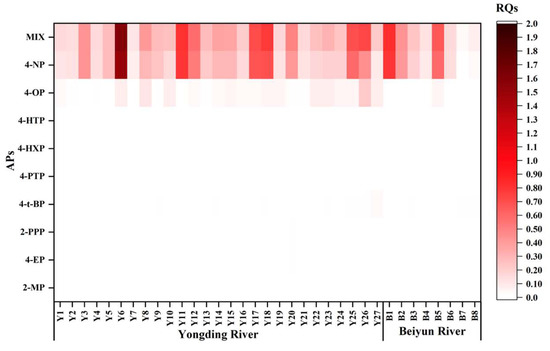 Heat plot of the ecotoxicological risks (represented by chronic RQs) of each AP (y axis) for aquatic organisms in the Yongding River and Beiyun River sampling sites (x axis).