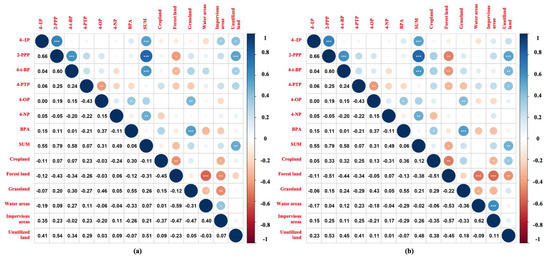 Figure 6 shows that the concentration levels and risk quotient of the APs were negatively correlated with the forested land use type within 500 m, 1 km, and 2 km, which indicates that forested land use may reduce the concentrations and risk quotient of APs. Moreover, the concentration levels and risk quotient of the APs were found to be positively correlated with the cropland and unutilized land use types within 500 m, 1 km, and 2 km, indicating that the cropland areas were important sources of APs in the water. Other sources of APs were not represented, such as industrial, medical, and other land use types, and may have been unutilized land.