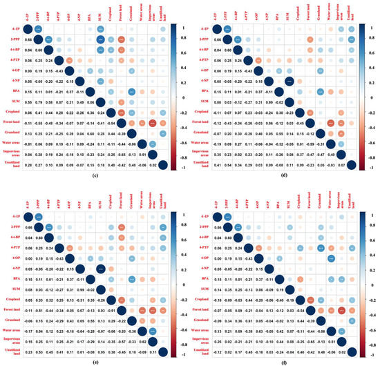 Relationships between the land use patterns and the concentration levels and risk quotient of the APs. (a–c) Relationships between the land use modes and concentration distributions of the APs within 500 m, 1 km, and 2 km, respectively. (d–f) Relationships between the land use modes and the risk quotient of the APs within 500 m, 1 km, and 2 km, respectively. Note: In the figure, the blue circles indicate positive correlations, and red circles indicate negative correlations. The larger the circle, the greater the correlation. * p < 0.05. ** p < 0.01. *** p < 0.001.