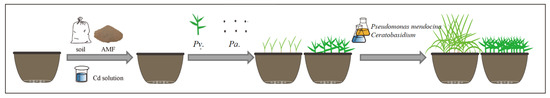 The sterilized soil was mixed with CdCl2 · 2.5H2O solution to make three kinds of soil with different concentrations of cadmium (10 mg/kg, 50 mg/kg, and 100 mg/kg). Each pot was placed in 600 g soil. The contaminated soil was stabilized by placing it in the pot for a week. Pennisetum alopecuroides was planted in the form of seeds, and Paspalum vaginatum was planted through stem segments. Each pot eventually grew five plants. The three microorganisms were inoculated into the soil in a single or mixed form. The inoculation method of AMF was directly mixed with the original soil. After propagation with corn, the sand containing AMF was mixed with the original soil (Each pot was 5 g, and the control group was mixed with the same amount of sterilized sand). The inoculation method for bacteria and fungi was root injection. After the medium was shaken evenly, a 10 mL medium containing bacteria or fungi was directly injected into the rhizosphere soil at the seedling stage. The incubation time was 45 days; the greenhouse temperature was set at 27 degrees; the daily illumination time was 14 h (7 AM-9 PM); and the water was poured every two days. The experimental design of the microorganism evaluation test is shown in Figure 1.