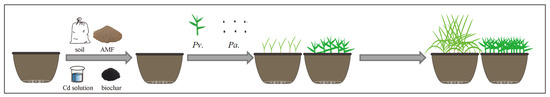 The experiment was divided into two stages. In the first stage of the experiment, the effects of single or mixed inoculation of three microorganisms on the phytoremediation efficiency of Paspalum vaginatum and Pennisetum alopecuroides were tested under three different degrees of cadmium-contaminated soil (low 10 mg/kg, medium 50 mg/kg, and high 100 mg/kg). After the experiment, the microorganisms were evaluated by measuring and analyzing the biomass of plants and the cadmium concentration in plants. The optimal combination of microorganisms determined by the first stage test will continue to be used in the second stage test. In the second stage, different doses of biochar were added on the basis of the first stage to explore the effect of biochar and microorganisms on phytoremediation.
