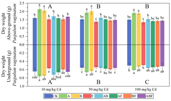 The biomass of Paspalum vaginatum under different microorganisms and cadmium concentrations. (CK represents no processing, A represents AMF, B represents bacteria, F represents fungi, AB represents AMF + bacteria, AF represents AMF + fungi, BF represents bacteria + fungi, and ABF represents AMF + bacteria + fungi. Duncan’s multiple-range test was used, n = 3, p ≤ 0.05, Different lowercase letters indicate significant differences in plant biomass between different microorganism treatment groups at the same cadmium level. A, B, C indicate the difference between different cadmium concentration treatment groups).