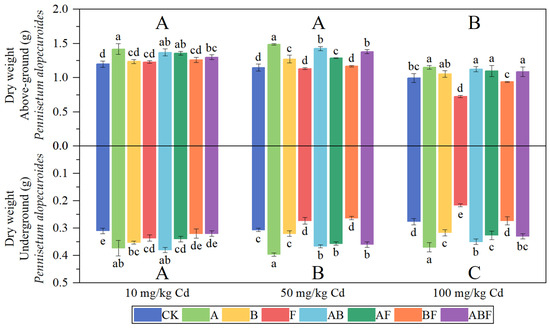 The biomass of Pennisetum alopecuroides under different microorganisms and cadmium concentrations. (CK represents no processing, A represents AMF, B represents bacteria, F represents fungi, AB represents AMF + bacteria, AF represents AMF + fungi, BF represents bacteria + fungi, and ABF represents AMF + bacteria + fungi. Duncan’s multiple-range test was used, n = 3, p ≤ 0.05, Different lowercase letters indicate significant differences in plant biomass between different microorganism treatment groups at the same cadmium level. A, B, C indicate the difference between different cadmium concentration treatment groups).