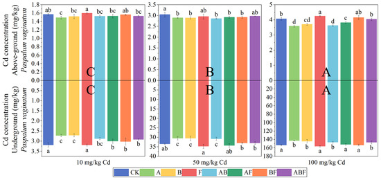 Cadmium concentration in Paspalum vaginatum under different microorganisms and cadmium concentrations. (CK represents no processing, A represents AMF, B represents bacteria, F represents fungi, AB represents AMF + bacteria, AF represents AMF + fungi, BF represents bacteria + fungi, and ABF represents AMF + bacteria + fungi. Duncan’s multiple-range test was used, n = 3, p ≤ 0.05, Different lowercase letters indicate significant differences in cadmium concentration in plants from different microorganisms treatment groups at the same cadmium level. A, B, C indicate the difference between different cadmium concentration treatment groups).