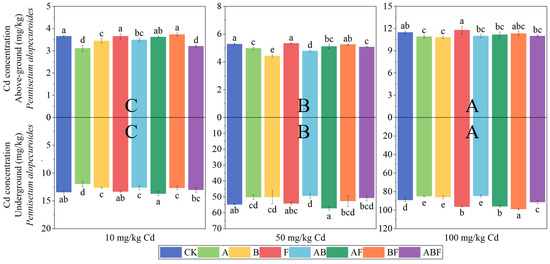 Cadmium concentration in Pennisetum alopecuroides under different microorganisms and cadmium concentrations. (CK represents no processing, A represents AMF, B represents bacteria, F represents fungi, AB represents AMF + bacteria, AF represents AMF + fungi, BF represents bacteria + fungi, and ABF represents AMF + bacteria + fungi. Duncan’s multiple-range test was used, n = 3, p ≤ 0.05, Different lowercase letters indicate significant differences in cadmium concentration in plants from different microorganism treatment groups at the same cadmium level. A, B, C indicate the difference between different cadmium concentration treatment groups).
