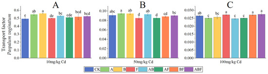 Transport factors of Paspalum vaginatum under different microorganisms and cadmium concentrations. (CK represents no processing, A represents AMF, B represents bacteria, F represents fungi, AB represents AMF + bacteria, AF represents AMF + fungi, BF represents bacteria + fungi, and ABF represents AMF + bacteria + fungi. Duncan’s multiple-range test was used, n = 3, p ≤ 0.05, Different lowercase letters indicate significant differences in the cadmium transport factors of plants from different microorganism treatment groups under the same cadmium level. A, B, C indicate the difference between different cadmium concentration treatment groups).