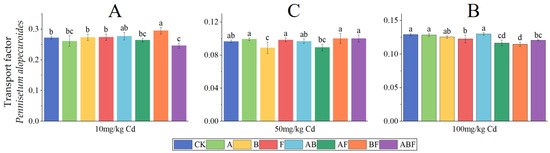 Transport factors of Pennisetum alopecuroides under different microorganisms and cadmium concentrations. (CK represents no processing, A represents AMF, B represents bacteria, F represents fungi, AB represents AMF + bacteria, AF represents AMF + fungi, BF represents bacteria + fungi, and ABF represents AMF + bacteria + fungi. Duncan’s multiple-range test was used, n = 3, p ≤ 0.05, Different lowercase letters indicate significant differences in the cadmium transport factors of plants from different microorganism treatment groups under the same cadmium level. A, B, C indicate the difference between different cadmium concentration treatment groups).
