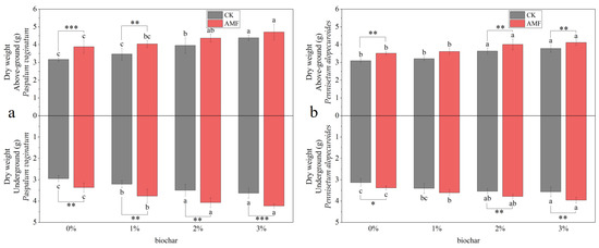 The biomass of Paspalum vaginatum (a) and Pennisetum alopecuroides (b) under different concentrations of biochar and AMF treatment. (Duncan multiple-range test was used, n = 6, p ≤ 0.05, Different lowercase letters indicate significant differences in plant biomass in different concentrations of biochar treatment groups under the same microorganisms treatment. The asterisk represents the significant difference between the AMF addition group and the control group under the same biochar concentration treatment, and a one-way analysis of variance is used. CK represents no processing. * p < 0.05, ** p < 0.01, *** p < 0.001).