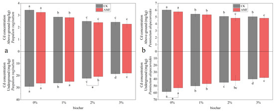 Cadmium concentration in Paspalum vaginatum (a) and Pennisetum alopecuroides (b) under different concentrations of biochar and AMF treatment. (Duncan multiple-range test was used, n = 6, p ≤ 0.05. Different lowercase letters indicate significant differences in cadmium concentration in plants treated with different concentrations of biochar under the same microorganism treatment. The asterisk represents the significant difference between the AMF addition group and the control group under the same biochar concentration treatment, and a one-way analysis of variance is used. CK represents no processing).