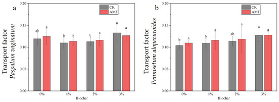 Transport factors of Paspalum vaginatum (a) and Pennisetum alopecuroides (b) under different concentrations of bio-char and AMF treatment. (Duncan multiple-range test was used, n = 6, p ≤ 0.05; different lowercase letters indicate significant differences in cadmium transport factors in plants treated with different concentrations of biochar under the same microorganism treatment. CK represents no processing).