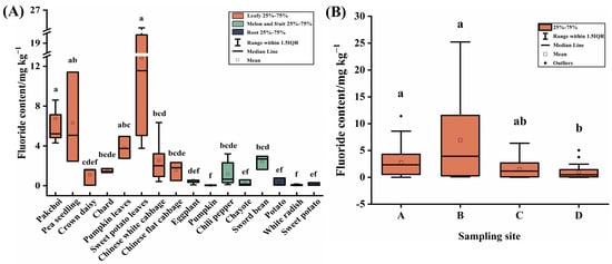 - Wang, M.; Liu, L.; Chen, D.; Hamid, Y.; Shan, A.; Chen, Z.; Yu, S.; Feng, Y.; Yang, X. Fluorine in 20 vegetable species and 25 lettuce cultivars grown on a contaminated field adjacent to a brick kiln. Environ. Geochem. Health 2023, 45, 1655–1667. [Google Scholar] [CrossRef]