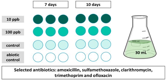 An experimental design (see Figure 1) was established to evaluate the antibiotic phycoremediation capacity of two chlorella species (Chlorella protothecoides and Chlorella vulgaris). To assess the algal uptake of individual antibiotics, a highly concentrated medium supplemented with additional salts (reference numbers 2014/09181 and US20150175457 A1), prepared in autoclaved deionized water, was used for algal incubation. For each antibiotic, two concentrations (one environmentally relevant and another ten times higher) were tested in triplicate and collected at 2-time points (7 and 10 days); longer time frames of up to 10 days were used to mimic the retention times of the passive wastewater treatment ponds.