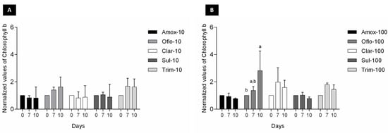 Changes in chlorophyll b content of Chlorella sp. consortia (data normalized by the control) exposed to the target antibiotics (A) 10 ppb and (B) 100 ppb over a 10-day period, measured at 0, 7, and 10 days; results are expressed as average ± SD (n = 3); significant differences between days are marked with superscript letters.