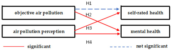Previous research has shown that the impact of air pollution on psychological effects largely depends on perceived levels of pollution rather than objective levels of pollution [54]. Liao et al. [45] specifically compared the effects of subjective and objective air quality on life satisfaction. Clearly, the above studies illustrate that there are complex and rich psychological mechanisms underlying the relationship between air pollution and health, and this study focused on the perception of pollution. Therefore, we proposed the following hypotheses: