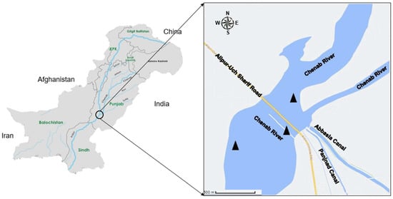 The Panjnad headwork is situated at an altitude of 99 m above sea level. The area experiences an average annual rainfall of 3.56 mm, an average annual temperature of 29.49 °C, and an average annual relative humidity of 27.64%. As it is the confluence point of various rivers, the Panjnad headwork receives a diverse range of pollutants from these rivers. The primary sources of pollution in the Panjnad headwork are agricultural, domestic, and industrial wastes from various cities, such as Gujarat, Faisalabad, Jhang, and Multan. These wastes come from industries such as textile, dyeing, petrochemical, hosiery, oil refineries, sugar and flour mills, distilleries, tannery, rubber, and plastics. They are discharged into the river ecosystem, which further contributes to the pollution in the region []. For this study, samples were collected from three stations (SI, SII, and SIII) between September 2021 and May 2022 (Figure 1). Throughout the study period, the sampling stations were visited every month. The selection of sites was based on different levels of pollutant accumulation. The current study conducted three replications during each season at each site, resulting in a total of nine replications for each experimental factor.
