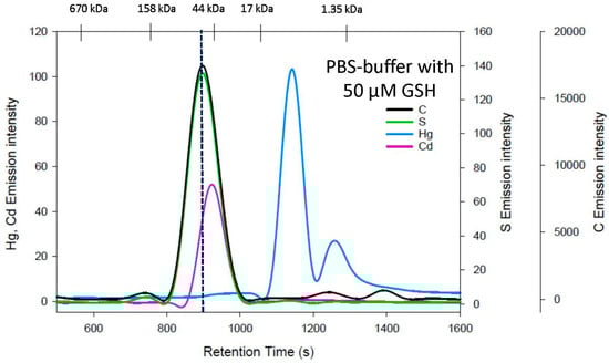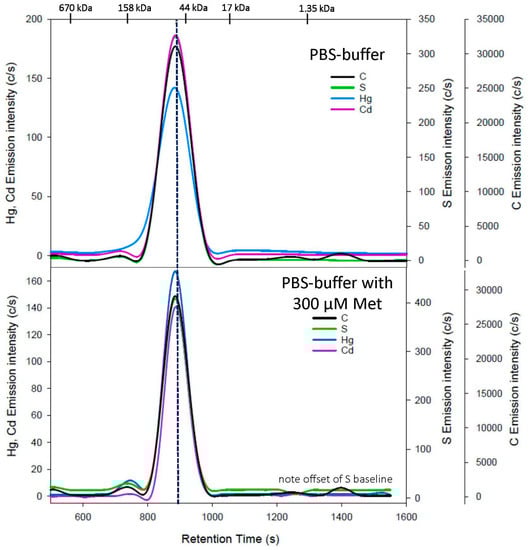 The analysis of an HSA/Hg/Cd complex with PBS buffer resulted in a single Hg peak (tr = 880 ± 2 s) and a single Cd peak (tr = 887 ± 2 s), as well as co-eluting single C and S peaks (Figure 1, top). The co-elution of Hg and Cd shortly before the 44 kDa MW marker is congruent with the elution of the intact HSA/Hg/Cd complex. When the same HSA/Hg/Cd complex was analyzed with a PBS buffer that contained 300 µM Met, essentially identical Hg-, Cd-, C-, and S-specific chromatograms were observed (Figure 1, bottom), which indicates that Met—which does not contain a free thiol group—did not adversely affect the integrity of the HSA/Hg/Cd complex. We note that one major limitation of our chosen approach is the fact that it does not allow us to investigate <50 µM of Cys or hCys in the mobile phase, as these are prone to rapid oxidation at neutral pH []. To enhance the clarity of the discussion that follows, we will now discuss the obtained results separately for each SMW thiol and each metal.
