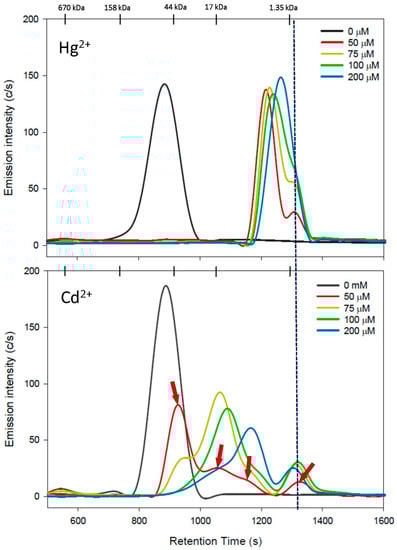 The results that involved the utilization of an SEC-ICP-AES system to observe the effect of 50 μM Cys, hCys, or GSH dissolved in the mobile phase on the stability of an HSA/Hg/Cd complex revealed that Hg2+ is more effectively mobilized under these conditions compared to Cd2+ (Figure 2). While Hg2+ was mobilized from HSA to form two Hg species (possibly mononuclear and binuclear Hg complexes) [], Cd2+ was mobilized to form four Cd species altogether (see red arrows in Figure 2), which may be attributed to the mobilization of Cd2+ from its two strong binding sites on HSA [].