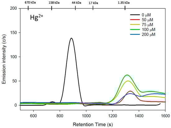 Representative Hg-specific chromatograms obtained using SEC-ICP-AES for the analysis of an HSA/Hg/Cd complex labeled with a mobile phase containing hCys (from 0 to 200 µM) in PBS buffer (pH 7.4) using a Superdex 200 Increase 10/300 GL SEC column (10 × 300 mm ID × length, 8 µm particle size, fractionation range: 600–10 kDa). Flow rate: 1.0 mL/min; injection volume: 500 µL; detector: Prodigy High-Dispersion ICP-AES of Hg at 253.652 nm. Retention times of molecular weight standards are indicated at the top. The scale of the x-axis was chosen to be consistent with that in Figure 1, which resulted in the remainder of the peaks not being shown. The entire peak intensities were used to calculate the peak areas shown in Table 1.