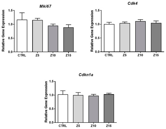 Effects of ZnO NP exposure on cell cycle regulators in antral follicles. Antral follicles were cultured in vitro and exposed to ZnO NPs at 5, 10, and 15 µg/mL. RNA was extracted from follicles, reversed transcribed to cDNA, and subjected to qPCR. mRNA levels of Ki67, Cdk4, and Cdkn1a were assessed. Graphs represent means ± SEM from three independent experiments (12–15 follicles per group). No significant differences were shown after ANOVA comparisons. CTRL: control, Z5: ZnO NPs 5 µg/mL, Z10: ZnO NPs 10 µg/mL, Z15: ZnO NPs 15 µg/mL.