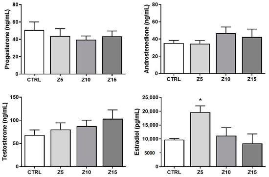 Effects of ZnO NP exposure on sex steroid hormone levels. Culture media were subjected to enzyme-linked immunosorbent assays. Graphs represent means ± SEM from three independent experiments (12–15 follicles per group). The asterisk (*) indicates significant difference from the control (p ≤ 0.05). CTRL: control, Z5: ZnO NPs 5 µg/mL, Z10: ZnO NPs 10 µg/mL, Z15: ZnO NPs 15 µg/mL.