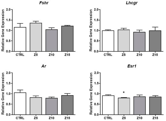 Hormone synthesis is tightly regulated at different levels, including the levels of hormone receptors [24]. Thus, we evaluated the effects of ZnO NPs on the expression of key steroid hormone receptors in antral follicles. None of the tested concentrations of ZnO NPs affected the expression of the Fshr, Lhcgr, and Ar. However, the lowest concentration (5 µg/mL) of ZnO NPs decreased Esr1 expression compared to the control group (Figure 5).