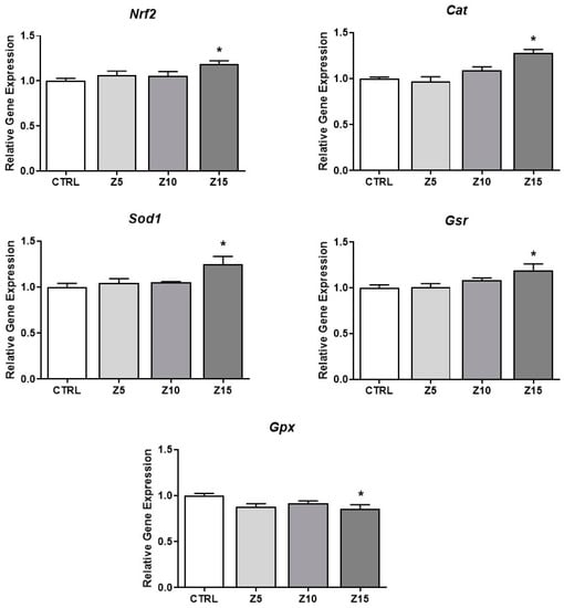 ZnO NPs have been shown to induce oxidative stress [25]. To determine if ZnO NP exposure at the tested concentrations induced oxidative stress in the antral follicles, we evaluated antioxidant responses. The highest concentration of ZnO NPs (15 µg/mL) induced the expression of Nrf2, an important nuclear factor involved in regulation of cellular resistance to oxidants [26], induced the expression of the antioxidant enzymes Cat, Sod1, and Gsr, and decreased the expression of the antioxidant enzyme Gpx compared to the control (Figure 6).