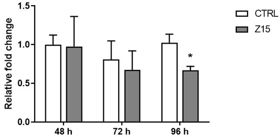 Based on the above results, we next determined if exposure to ZnO NPs at 15 µg/mL induced the formation of ROS in cultured antral follicles at different timepoints. Exposure to ZnO NPs (15 µg/mL) did not induce ROS after 48 h and 72 h. However, exposure to ZnO NPs (15 µg/mL) for 96 h resulted in a significant decrease in the relative levels of reactive oxygen/nitrogen species compared to control (Figure 7).