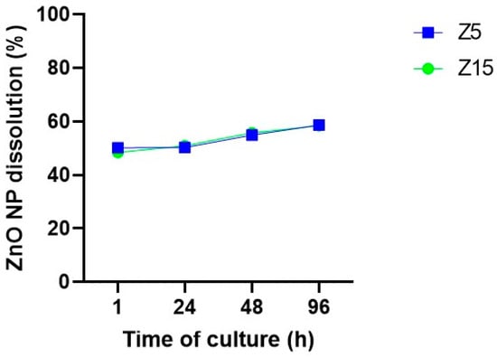 Physicochemical characteristics such as dissolution and aggregation effects are relevant for toxicological outcomes of NPs [27,28]. Based on previous observations [20], ZnO NP dissolution was assessed in our system to determine whether NPs are being internalized as NPs and/or as ions. Zinc levels on centrifuged media were evaluated after 1, 24, 48, and 96 h of culture to determine the time course of ZnO NP dissolution. Our data show that ZnO NP dissolution starts early in the culture, with 48% and 50% dissolution after 1 h of culture for 15 and 5 µg/mL, respectively. NP dissolution increased up to ~58% after 96 h of culture (Figure 8).