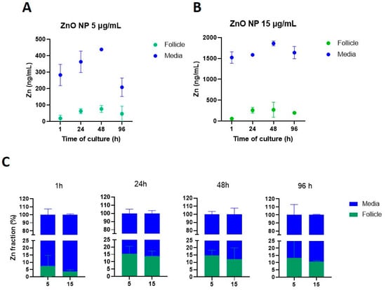 Zinc (Zn) internalization from ZnO NPs into cultured antral follicles. Antral follicles were exposed to ZnO NPs (5 and 15 µg/mL) for 1, 24, 48, and 96 h. Following follicle washing protocols to collect the supernatant from culture media, the corresponding samples were subjected to ICP-MS to quantify Zn levels. Zinc levels are presented as concentrations in antral follicles and culture media (panels (A) and (B), respectively), and as fractions of the total Zn content in the system over time (C) from incubations with 5 and 15 µg/mL ZnO NPs. Graphs represent means ± SEM from two independent experiments (12–15 follicles per group).
