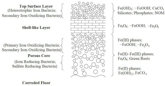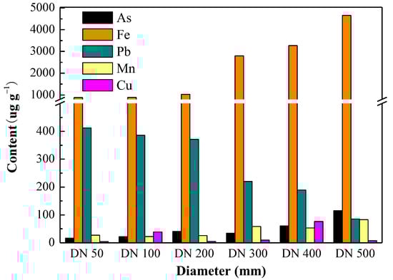 However, the formation process of the corrosion layer in the water network is still subject to further research. Concurrently, there are a small amount of other metal elements in cast iron pipes, such as manganese (Mn) and copper (Cu). Trace amounts of metal elements are also present in factory drinking water. These metal elements precipitate onto or are adsorbed onto the corrosion layer (Figure 2), forming other corrosion products, such as MnO2 and CuO, through a series of oxidation-reduction reactions [23].