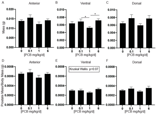 Developmental exposure to 1 mg/kg PCBs daily decreases ventral prostate wet weight in male offspring compared to other PCB treatment groups. Dams were exposed to PCBs orally through gestation and lactation. Prostates were collected and weighed from young adult offspring at 6 weeks of age. Quantification of average mass in (A) anterior, (B) ventral, and (C) dorsal prostates as well as mass normalized to body mass in (D) anterior, (E) ventral, and (F) dorsal prostates. Results are mean ± SEM, n = 15–18 per treatment group. p values ≤ 0.05 as determined by (A) Welch’s ANOVA test and (B–F) Kruskal–Wallis Test followed by Dunn’s multiple comparisons tests. * and bar indicate significance between dosing groups.
