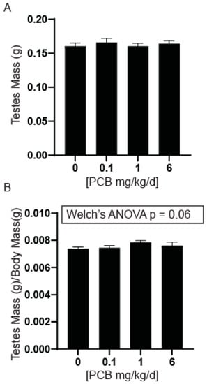 Prostatic development, growth, and maturation are dependent upon testicular androgens [33,34,35,36]. Irregularities in testicular wet weight can indicate cellular toxicity or damage which can influence testosterone levels [37,38,39]. Since we observed a PCB-induced decrease in prostate wet weight and developmental exposure to PCBs has also been shown to reduce testes size in rats [40], we examined testes wet weight. There was no significant difference in testes wet weight between treatment groups (Figure 2A). When normalized to body mass there was a trend (p = 0.06) for an increase in testes/body mass in the 1 mg/kg PCB treatment group compared to control (Figure 2B).