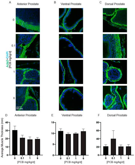 PCBs have no effect on prostate smooth muscle thickness in developmentally exposed male mice. Male mice were exposed to PCBs via maternal diet through gestation and lactation and prostates were collected at 6 weeks of age for immunohistochemistry. Representative images of (A) anterior, (B) ventral, and (C) dorsal prostates of each PCB treatment group incubated with antibodies targeting alpha-smooth muscle actin (Acta2, green) to label smooth muscle and DAPI (blue) to label nuclei. Quantification of average muscle thickness in (D) anterior, (E) ventral, and (F) dorsal prostates. Results are mean ± SEM, n = 3–5 prostates per treatment group. The dashed line in the first figure of panel A represents the thickness measure of Acta2 positive cells. No significant differences as determined by (D) Kruskal–Wallis test (E) one-way ANOVA and (F) Welch’s ANOVA test.
