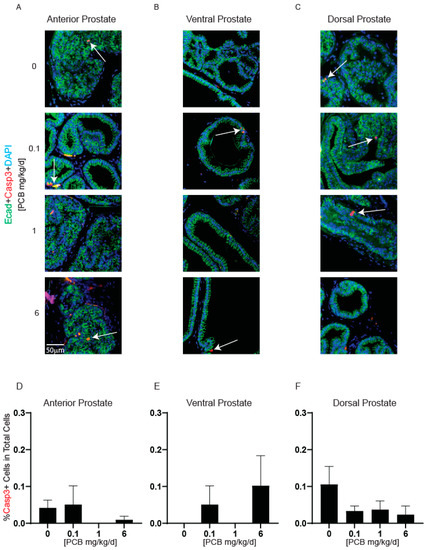 PCBs have no effect on prostate caspase 3 positive cells in developmentally exposed male mice. Male mice were exposed to PCBs via maternal diet through gestation and lactation and prostates were collected at 6 weeks of age for immunohistochemistry. Representative images of (A) anterior, (B) ventral, and (C) dorsal prostates of each PCB treatment group incubated with antibodies targeting cleaved caspase 3 (Casp3, red) to label apoptotic cells, e-cadherin (ECad) (CDH1, green) to label all epithelium and DAPI (blue) to label nuclei. Quantification of the percent of total cells Casp3 positive cells in (D) anterior, (E) ventral, and (F) dorsal prostate. Results are mean ± SEM, n = 3–5 per treatment group. No significant differences as determined by the Kruskal–Wallis test.
