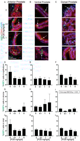 PCBs have no effect on prostate cell proliferation in developmentally exposed male mice. Mice were exposed to PCBs via the maternal diet throughout gestation and lactation, and prostates were collected from male offspring at 6 weeks of age for immunohistochemistry. Representative images of (A) anterior, (B) ventral, and (C) dorsal prostates at each PCB exposure group incubated with antibodies targeting Ki67 (green) to label replicating cells, e-cadherin (CDH1, red) to label epithelium and DAPI (blue) to label nuclei. Quantification of the percent Ki67+ cells in (D–F) epithelium, (G–I) stroma, and (J–L) total. Results are mean ± SEM, n = 3–5 prostates per group. No significant differences as determined by (E,I,K) one-way ANOVA, (D,F,G,H,L) Kruskal–Wallis test and (J) Welch’s ANOVA.