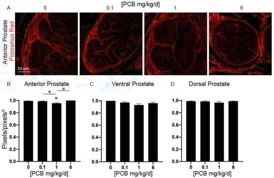 PCBs decrease collagen fiber density in the anterior prostate of developmentally exposed male mice. Dams were exposed to PCBs orally through gestation and lactation. Prostates were collected from young adult offspring at 6 weeks of age. Prostate sections were incubated with picrosirius red to visualize collagen (red). Representative images of (A) anterior prostate with each PCB exposure group. Quantification of collagen density (red, picrosirius red) in (B) anterior, (C) ventral, and (D) dorsal lobes of the prostate. Results are mean ± SEM, n = 3–4 per treatment group. p values ≤ 0.05 as determined by (B,C) one-way ANOVA followed by Tukey’s multiple comparison test, (D) Kruskal–Wallis test. * indicates a significant difference from control. * and bar indicate significance between dosing groups.
