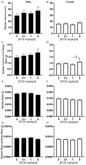- Kennedy, C.L.; Spiegelhoff, A.; Lavery, T.; Wang, K.; Manuel, R.S.; Wang, Z.; Wildermuth, H.; Keil Stietz, K.P. Developmental polychlorinated biphenyl (PCB) exposure alters voiding physiology in young adult male and female mice. Am. J. Clin. Exp. Urol. 2022, 10, 82–97. [Google Scholar] [PubMed]