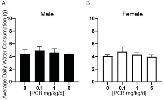 Developmental exposure to PCBs does not alter average daily water consumption. Dams were exposed to PCBs orally through gestation and lactation. Water consumption was measured for young adult offspring prior to the end of the study and tissue collection. Quantification of average daily water consumption in (A) male and (B) female mice. Results are mean ± SEM, n = 4–8 cages per treatment group. No significant differences as determined by (A) Kruskal–Wallis test and (B) one-way ANOVA.