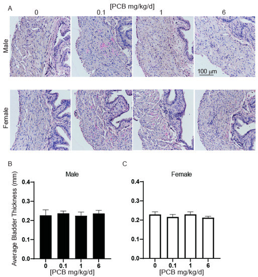 Developmental exposure to PCBs does not alter bladder thickness. Dams were exposed to PCBs orally through gestation and lactation. Bladders were collected from young adult offspring at 6 weeks of age. (A) Representative images of bladders in male and female mice for each treatment group. Quantification of average bladder thickness in (B) male and (C) female mice. Results are mean ± SEM, n = 6–12 per treatment group. No significant differences as determined by Kruskal–Wallis test.