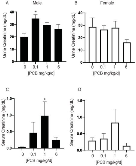 Developmental exposure to PCBs can increase serum and urine creatinine concentrations. Dams were exposed to PCBs orally through gestation and lactation. Quantification of average urine creatinine concentration in (A) male and (B) female mice, and average serum concentration in (C) male and (D) female mice at 6 weeks of age. Results are mean ± SEM, n = 4–5 per treatment group. p values ≤ 0.05 as determined by (A,B) one-way ANOVA followed by Tukey’s multiple comparisons and (C,D) Kruskal–Wallis Test followed by Dunn’s multiple comparisons. * indicates significant difference from the vehicle control.