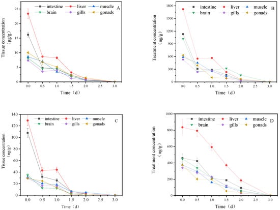 Short-term exposure test: 60 domesticated goldfish were placed into a 20 L culture barrel with 15 L of test water containing 40 mg/L IMI. The goldfish in the control group were cultured with fully aerated and chlorinated tap water. After 1 day of exposure, the golden crucian carp were transferred to clean water for feeding. During feeding, the breeding density was maintained at 4 fish/L, and the test water was updated daily to check for abnormal behavior and mortality. They were fed twice a day, and soon after feeding, the uneaten food and feces were sucked out of the culture bucket to avoid food absorption and adsorption. At 0 h, 0.5 d, 1 d, 1.5 d and 3 d after transfer, 5 fish were randomly selected from the experimental group (each fish was an independent sample), and the liver, intestine, muscle, gill tissue, brain tissue and gonads of the golden carp were dissected in an EP tube. The collection method for the golden crucian carp tissues refers to the collection method for the cyprinid fish in Zheng’s study []. After collection, the tissue weight was recorded, ground into a chymous shape with a tissue grinder, and stored at −80 °C until analysis.