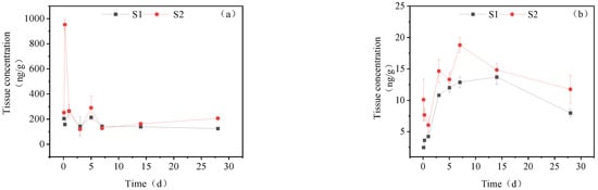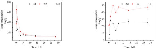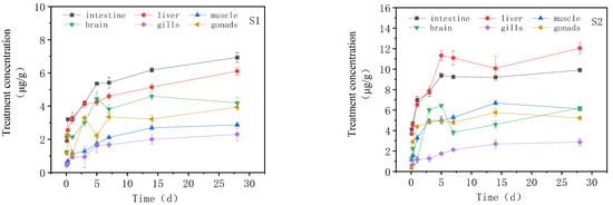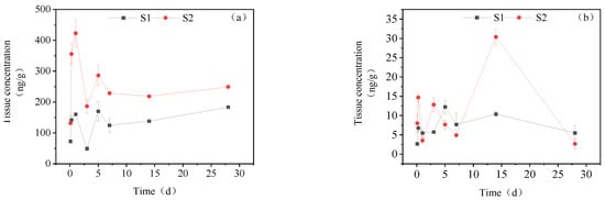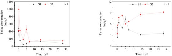 Concentration changes of IMI in goldfish under continuous exposure (treatment concentration: (S1) 20 mg/L; (S2) 40 mg/L).