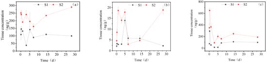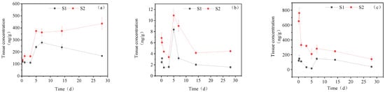 Concentration changes in IMI metabolites in muscle (treatment concentration: (S1) 20 mg/L; (S2) 40 mg/L): (a) IMI-urea; (b) 6-chloronicotinic acid; (c) 5-hydroxy-IMI.