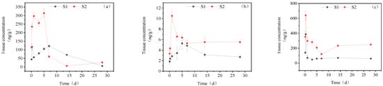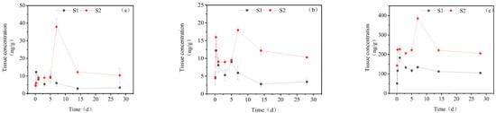 Concentration changes in IMI metabolites in gonads (treatment concentration: (S1) 20 mg/L; (S2) 40 mg/L): (a) IMI-urea; (b) 6-chloronicotinic acid; (c) 5-hydroxy-IMI.