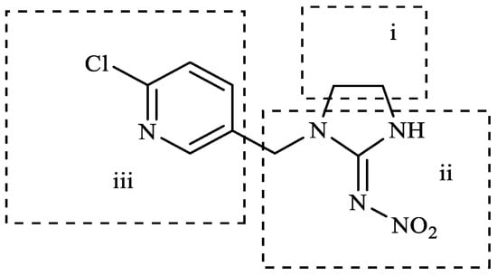 In this study, the highest ratio of the total content of metabolites detected in the liver to IMI was observed at 6 h after exposure, indicating that the liver is likely the earliest metabolic site for IMI in goldfish. The intestine was also found to be an important site for IMI metabolism. These findings are consistent with a previous study by Yang et al., which showed that the metabolism of thiamethoxam in zebrafish occurred in both the liver and intestine and that its metabolic pathway involved N-demethylation and nitro reduction []. After exogenous drugs enter the organism, phase I and phase II metabolism occur under the action of catalytic enzymes in the body. Phase I metabolism mainly involves hydroxylation, desaturation, dealkylation and nitro reduction, among other reactions. The cytochrome CYP450 enzyme, which exists in the liver, is an important oxidative metabolic enzyme that catalyzes these reactions []. The structure of IMI, shown in Figure 10, contains chemical reaction sites located on the methylene bridge chain (i structure), the pharmacophore nitroimine (ii structure), and the six-membered ring (iii structure), which can undergo a series of metabolic reactions under the action of catalytic enzymes in vivo. Based on these observations, we speculate that the possible metabolic pathway of imidacloprid in goldfish is shown in Figure 11. After IMI is absorbed into the liver through the intestine, and under the action of the cytochrome CYP450 enzyme in the liver, it first dehydrogenates to produce IMI-olefin in structure (i). Because of the unstable chemical properties of IMI-olefin, metabolic reactions such as hydroxylation and nitro reduction, respectively, produce 5-hydroxy-IMI, and IMI-urea and 6-chloronicotinic acid. These metabolites enter tissues through the circulatory system for enrichment or exclusion.