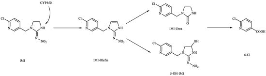 Upon detoxification and metabolism, the biological activity of IMI metabolites will decrease, but in some cases, IMI may produce more active metabolites. For instance, Suchail’s study revealed that the two secondary metabolites of IMI in bees, IMI-olefin and 5-hydroxy-IMI, may have a greater relationship with the toxicity of IMI. The toxicity of IMI-olefin is twice that of IMI and 10 times that of 5-hydroxy-IMI []. Additionally, studies have reported that the toxicity of IMI-olefin to Bemisia tabaci and Myzus persicae is approximately 10 times and 16 times higher than that of IMI, respectively, indicating that IMI alkenyl has higher toxicity than the parent compound []. In this study, a small amount of IMI-olefin was detected in the intestine and liver of goldfish, and further exploration of its subsequent effects on the intestine and liver can help clarify the toxicity mechanism of IMI-olefin. Moreover, metabolites with nitroimine pharmacophores, such as hydroxylated IMI and IMI-olefin, are toxic to bees, while IMI urea and 6-chloronicotinic acid, which are metabolites without pharmacodynamic groups, are nontoxic to bees []. The biological activities of IMI and its metabolites, from high to low, are olefinic IMI, IMI-urea, 4-hydroxy-IMI, 5-hydroxy-IMI and 4,5-dihydroxy-IMI. Thus, the biological activity of IMI is produced by the interaction of the parent and metabolites. In-depth studies on the differences in the metabolic pathways of IMI in target and nontarget organisms, as well as its metabolic differences in different parts of the same organism, can provide a better understanding of its toxic mechanism and provide ideas and references for the standardized use of IMI.